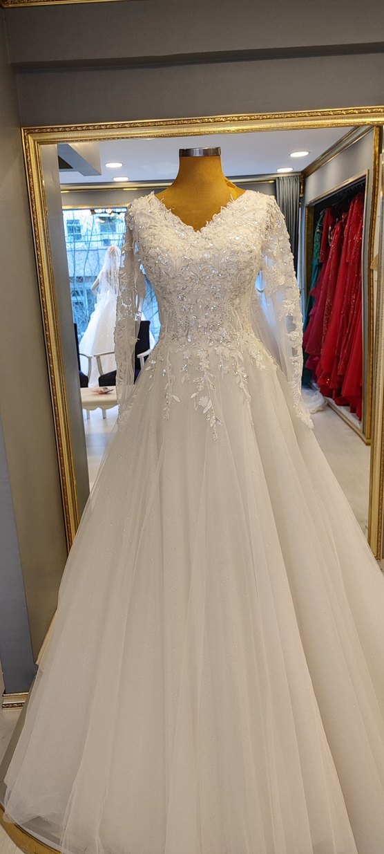 Beyaz prenses gelinlik, V yakalı ve uzun kollu çiçek işlemeli dantel detaylara sahiptir. Klasik ve zarif görünüm için regular fit ve uzun eteklidir.