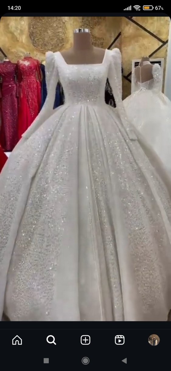 Bu beyaz prenses gelinlik, uzun kollu ve V yakalı dar kesim üst kısmıyla dikkat çeker. Uzun etek kısmı ışıltılı detaylarla klasik ve gösterişli bir tarz sunar. s m l beden