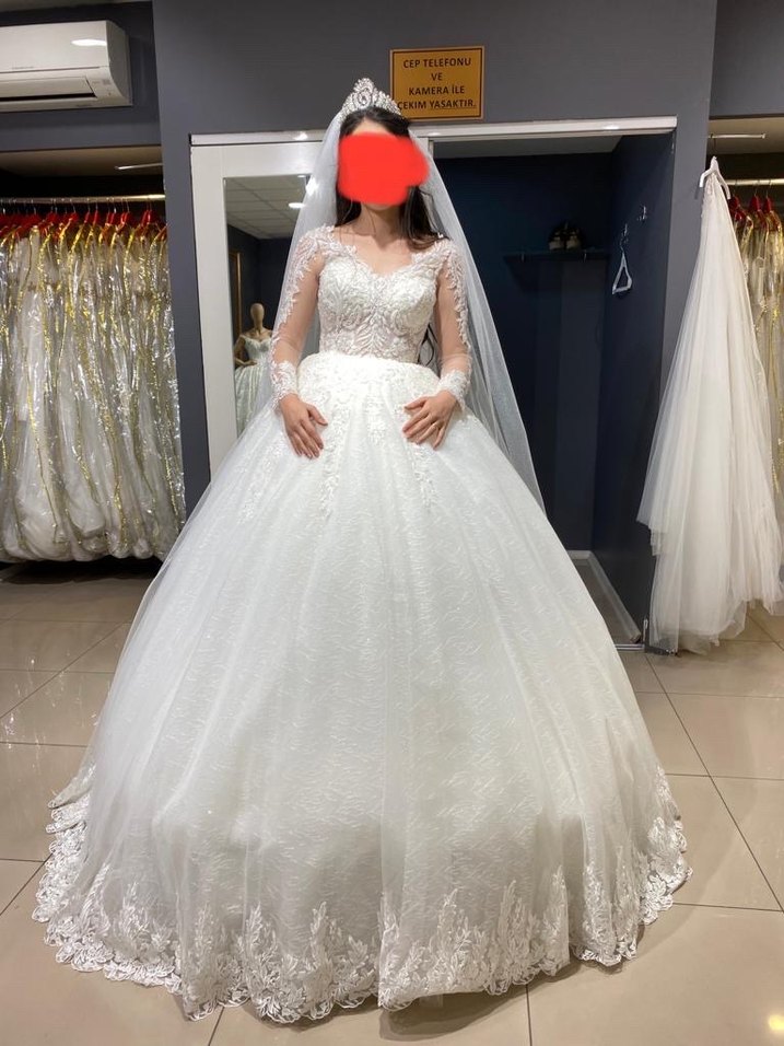 Beyaz prenses gelinlik, V yaka ve uzun kollu, vücuda oturan üst kısmı ile dikkat çeker. Etek kısmı uzun ve dantel detaylıdır, klasik ve gösterişlidir. 36-38-40 beden için uygundur arkası ipli fiyat sorunuz