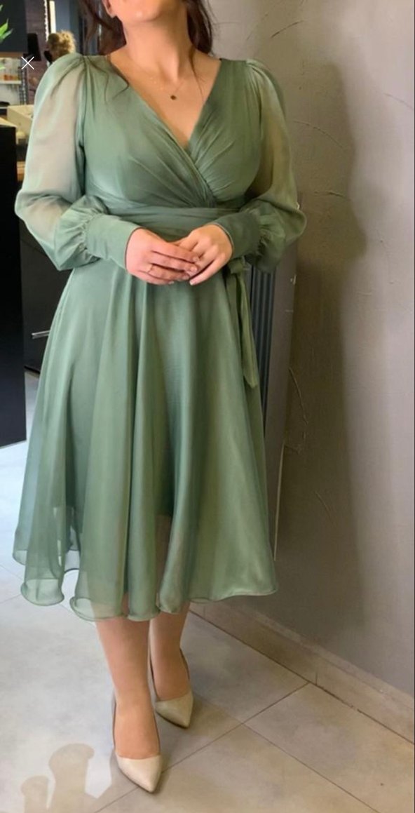 Haki renkli, uzun kollu, V yaka ve salaş kesim abiye elbise. Dökümlü tasarımı ve modern klasik stiliyle düğünler için uygun, şık ve zarif bir tercih. 1 kere giyildi temizdir