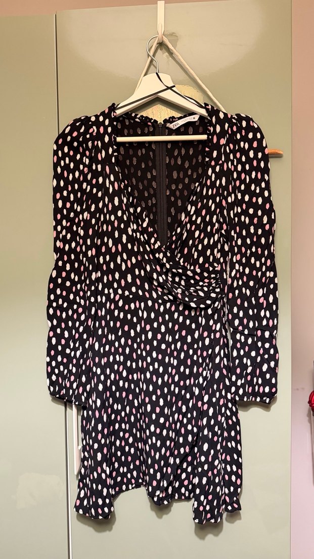 Uzun kollu, V yakalı ve drapeli detaylı siyah mini elbise, sentetik kumaştan ve koyu renkli batik desenlidir. Günlük kullanıma uygundur.