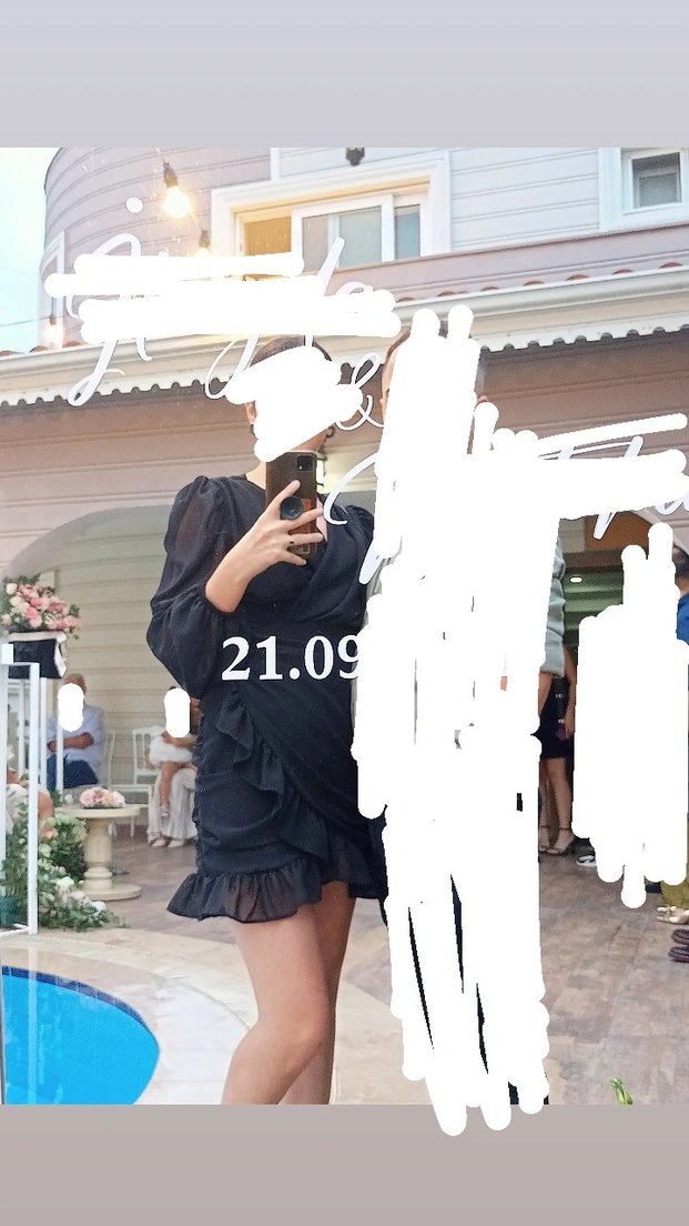 Siyah şifon kumaştan, uzun kollu ve V yakalı, fırfır detaylı, dar kesim mini elbise. İki kere arkadaşlarımın nişanlarında giyindim onun dışında hiç kullanılmadı 36 beden hiçbir sorunu yok.