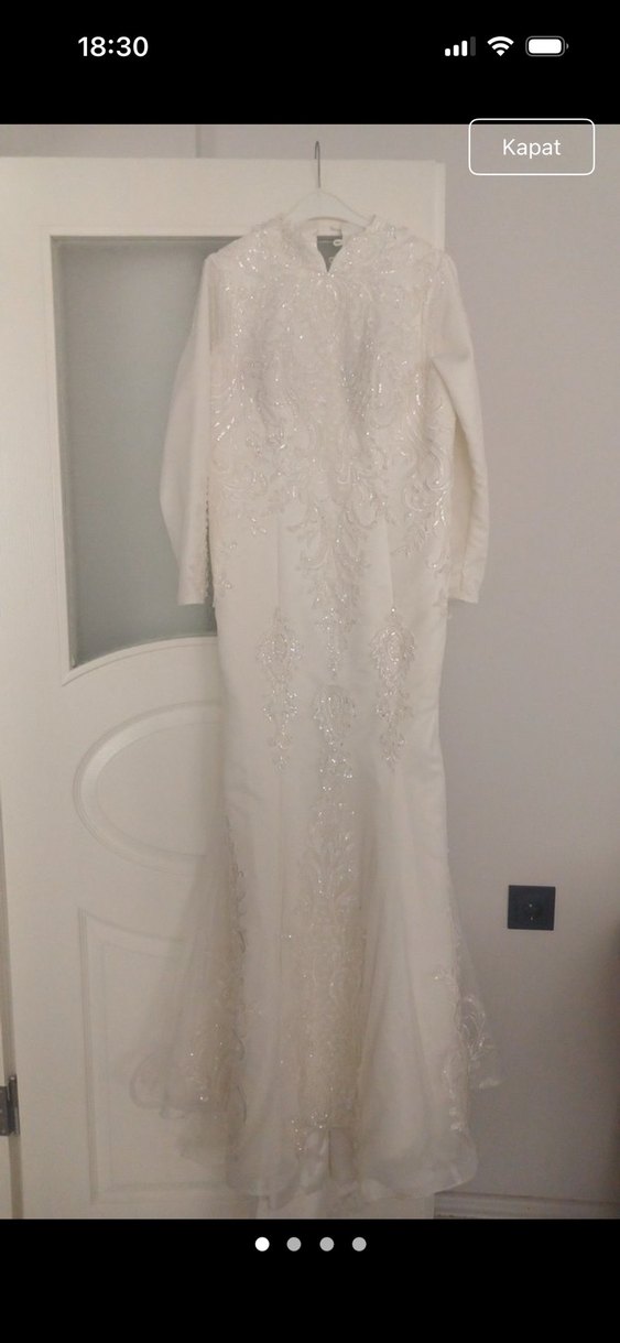 Uzun kollu ve V yakalı beyaz gelinlik, klasik ve sade tasarıma sahiptir. Düz kesim ve hafif işlemelerle şıklık sağlar.