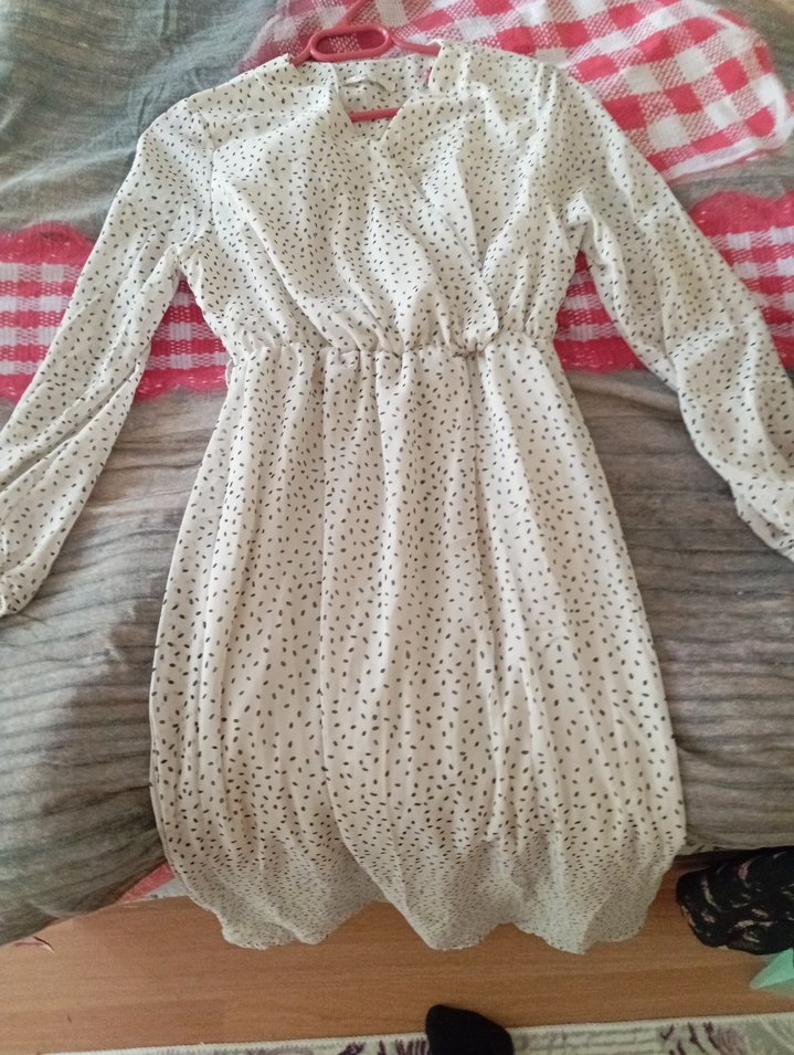 Uzun kollu, V yakalı beyaz midi elbise, dökümlü ve bol kesimdir. Yumuşak sentetik kumaştan yapılmıştır, bohem stil ve günlük kullanım için uygundur.