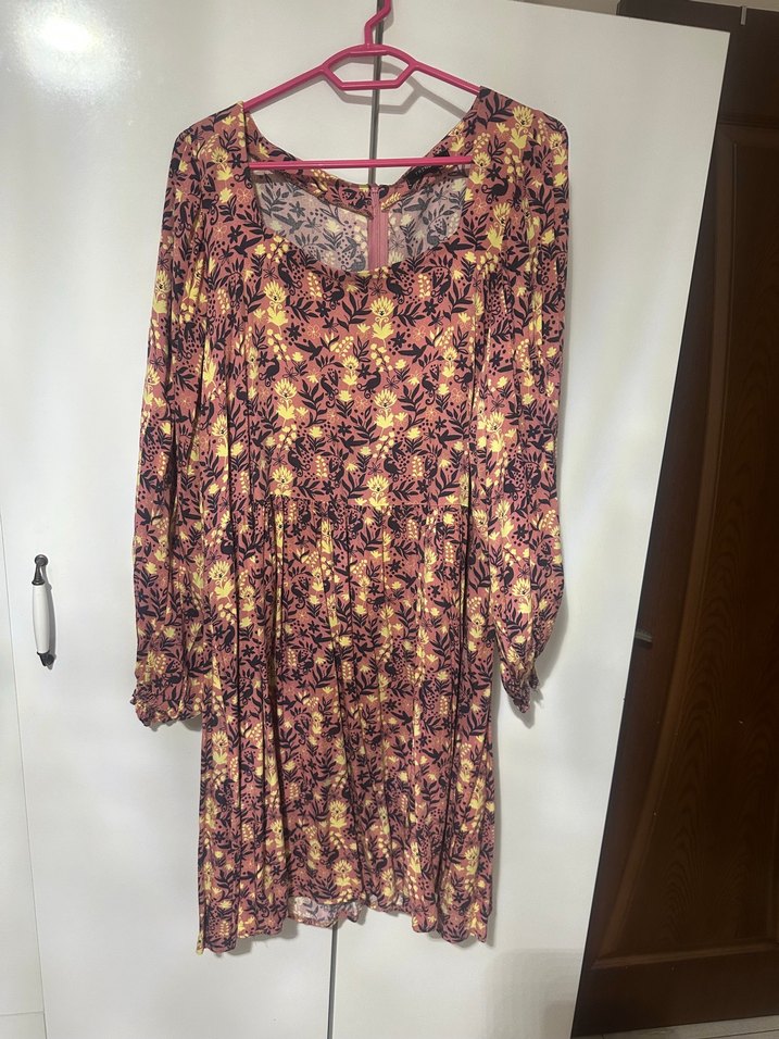 Bohem tarzda, uzun kollu, V yakalı ve pileli detaylı bol kesim elbise. Koyu çok renkli çiçek desenine sahip, günlük kullanıma uygun.