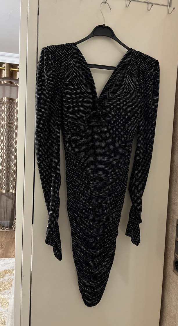 Drapeli tasarıma sahip, V yakalı ve uzun kollu siyah, vücuda oturan gece elbisesi. Desenli kumaşıyla gotik ve avangart tarzda, romantik akşamlar için uygun. Bir kere düğünde sadece iki saat giydim 38-40 beden dres roma abiyeciden aldım.çok kaliteli şık tertemiz
