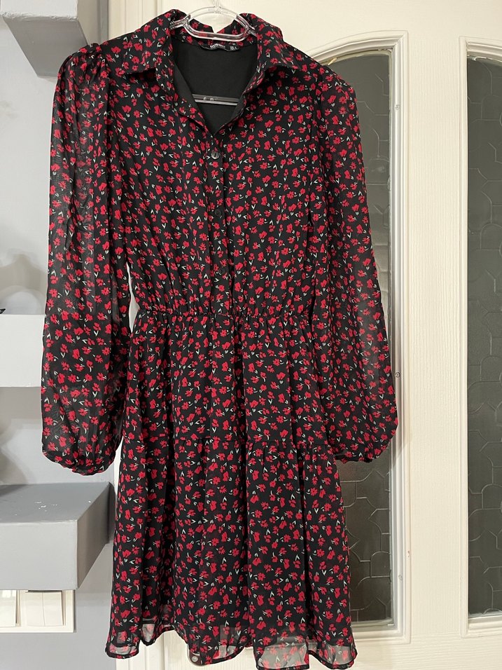 V yakalı, uzun kollu ve düğmeli, ince kesim mini elbise. Yumuşak sentetik kumaştan, koyu kırmızı çiçek desenli, gotik tarzda.