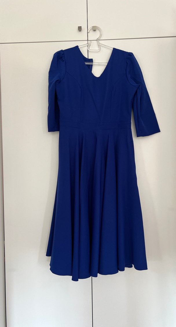 Koyu mavi, V yakalı, dökümlü ve bol kesim uzun elbise. Üç çeyrek kollu, ipeksi dokulu, minimalist normcore tarzda.