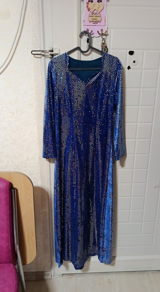 Uzun, bol kesim gece elbisesi, V yaka ve uzun kolludur. Parlak mavi batik deseniyle parti için şık ve göz alıcıdır. ✨kadife pul lu esnek