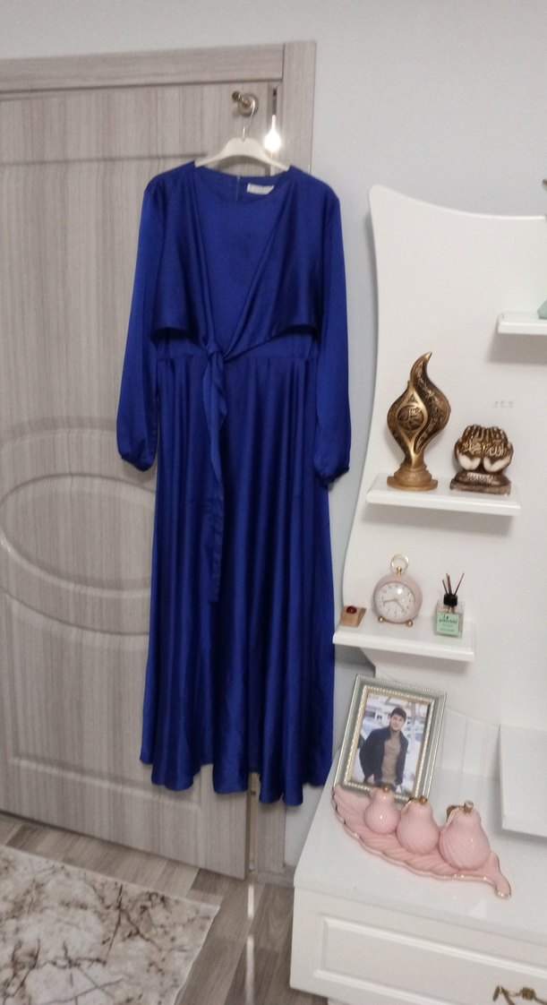 Uzun Kollu, V Yakalı Mavi Uzun Elbise