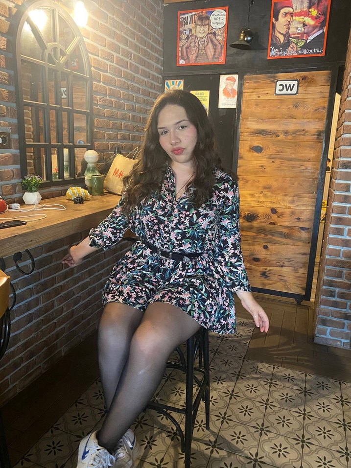 Uzun kollu, V yakalı, koyu gri batik desenli mini elbise. Kemer tokası ve yumuşak sentetik kumaş içerir. Romantik akşamlar için uygundur kızlar kemersiz satıyorum kumaşı o kadae güzel ki .