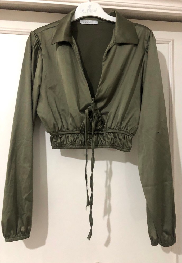 Parlak kumaştan, uzun kollu ve V yakalı kısa kesim, saten kumaş, fit kesim kadın bluz.