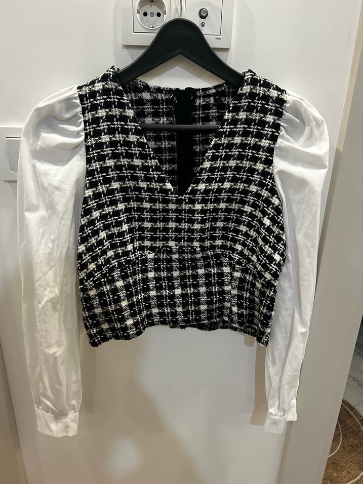 V yakalı ve uzun kollu, fitted kesim kadın bluz. Ön kısmı siyah beyaz kareli, kolları düğmeli ve beyaz renkte. Günlük kullanıma uygun, streetwear tarzında.