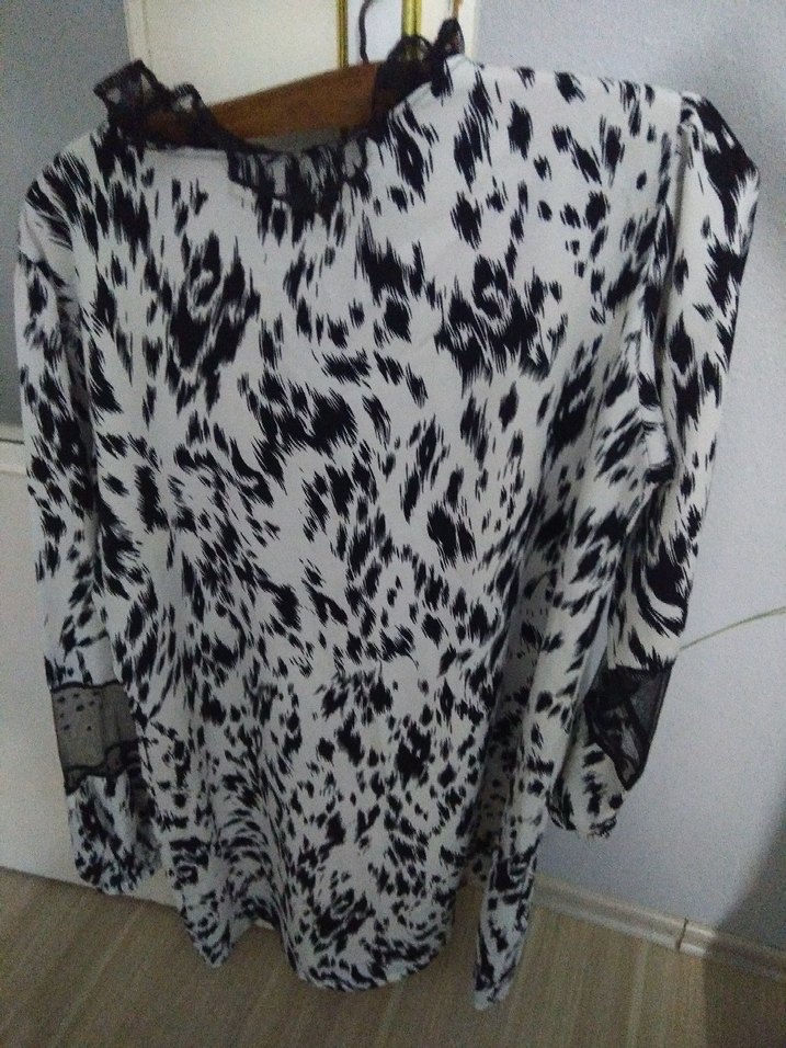 Uzun kollu, V yakalı zebra desenli bluz, kürk detaylıdır. Salaş kesim ve uzun boydadır, sokak stili için uygundur.