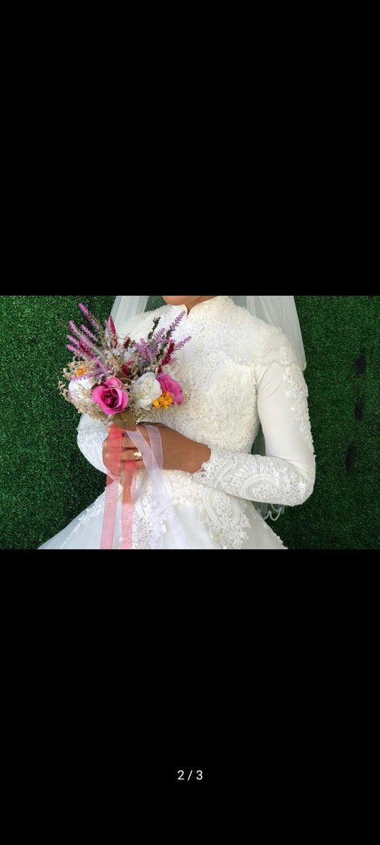 Uzun kollu, yüksek yakalı ve vintage detaylara sahip bu A kesim gelinlik, hafif beyaz renkte olup mütevazı ve klasik bir tarz sunar. özel dikimdir sadece bir kere giyildi arkası ayarlanabilir
