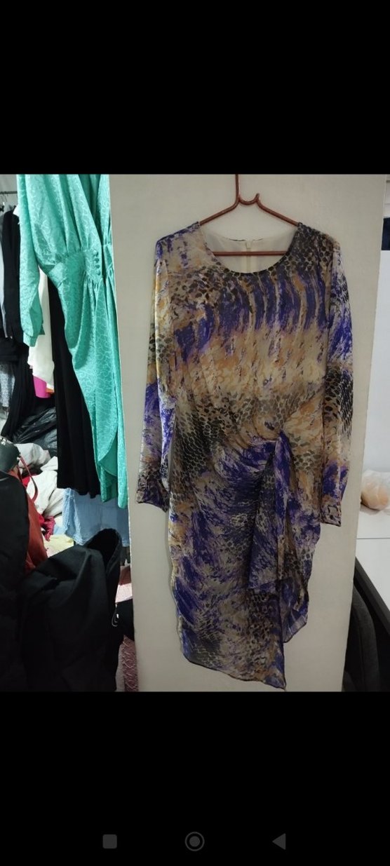 Drapeli elbise. Uzun kollu, tekne yakalı, koyu çok renkli tie-dye desene sahip, günlük kullanıma uygun.