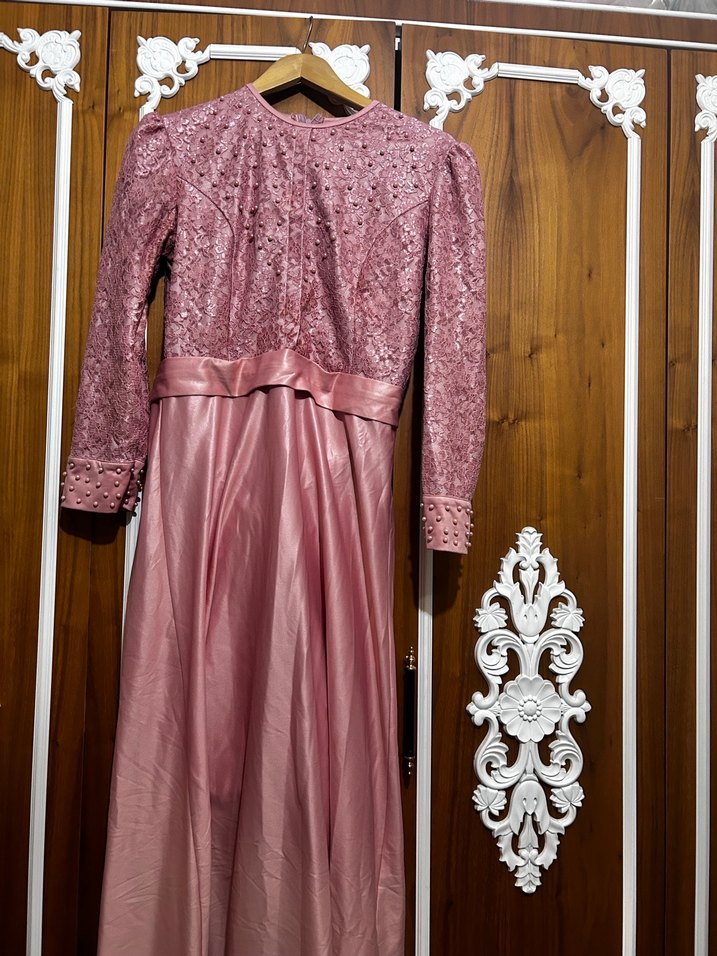 Uzun pembe abiye elbise, drapeli ve dar kesim. Uzun kollu, yüksek yakalı, parlak yüzeyli vintage tarzda, düğünler için uygun. Üst kısmı dantel ve süslemelidir. ✨
