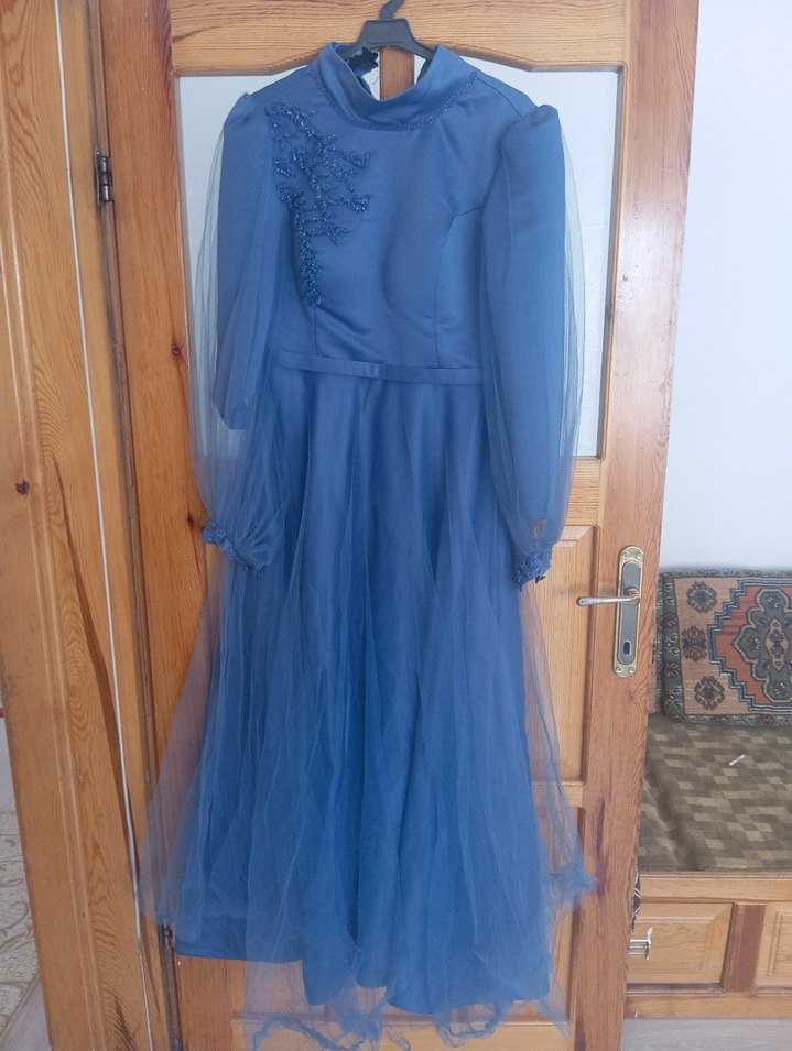 Uzun kollu, yüksek yakalı ve drapeli detaylara sahip bu uzun, dar kesim abiye elbise vintage gotik tarzda, düğünler için uygun gri-mavi tonlarda.