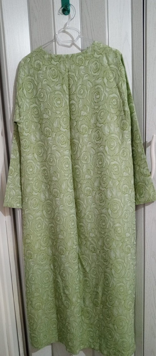 Uzun kollu, pastel yeşil kadın elbisesi, rahat kesim ve hafif kabartmalı çiçek desenine sahip vintage tarzda.BİR KERE GİYİLDİ. KENDİNDEN SİMLİ. İKİ KOLTUK ARASİ 48 CM, BOY 1.33
