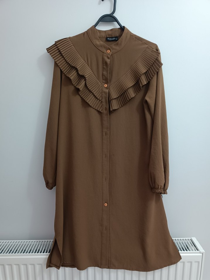 Uzun kahverengi tunik, yakalı ve göğüs kısmında fırfır detaylıdır. uzun kollu ve düğmeli kapamalıdır. Pürüzsüz sentetik kumaştan üretilmiştir.