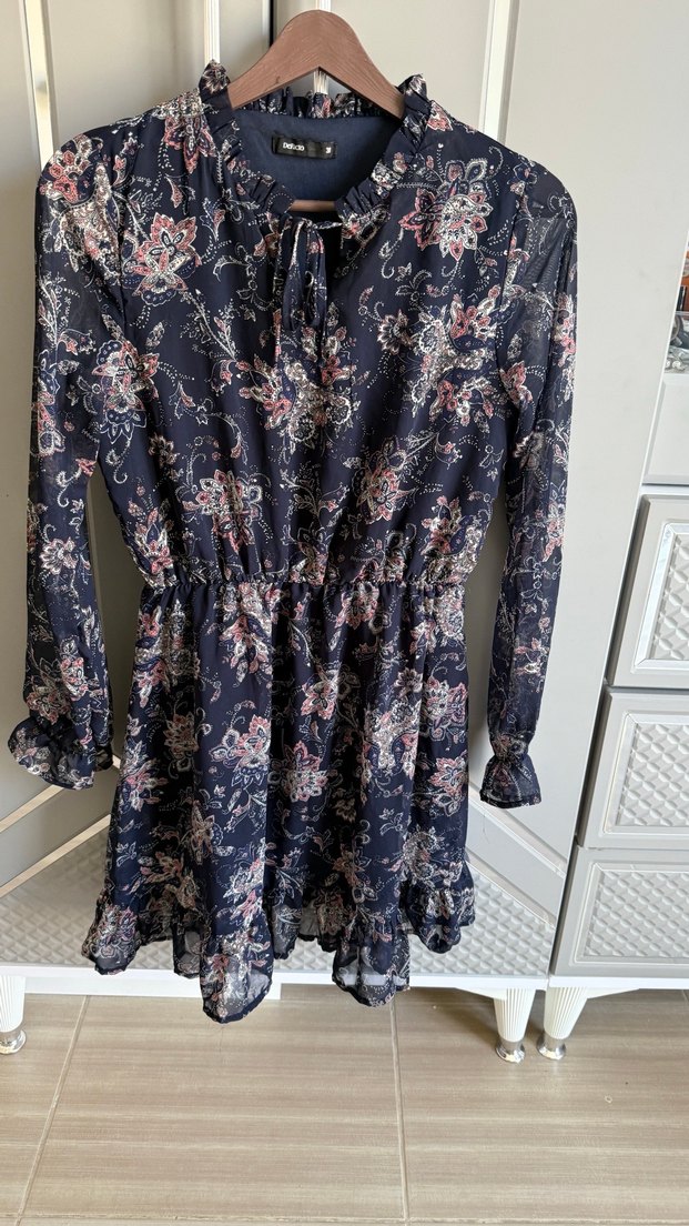 Uzun kollu, volan detaylı, koyu lacivert batik desenli bol kesim midi elbise. Yüksek yakalı ve sentetik kumaştan, günlük kullanım için uygun.