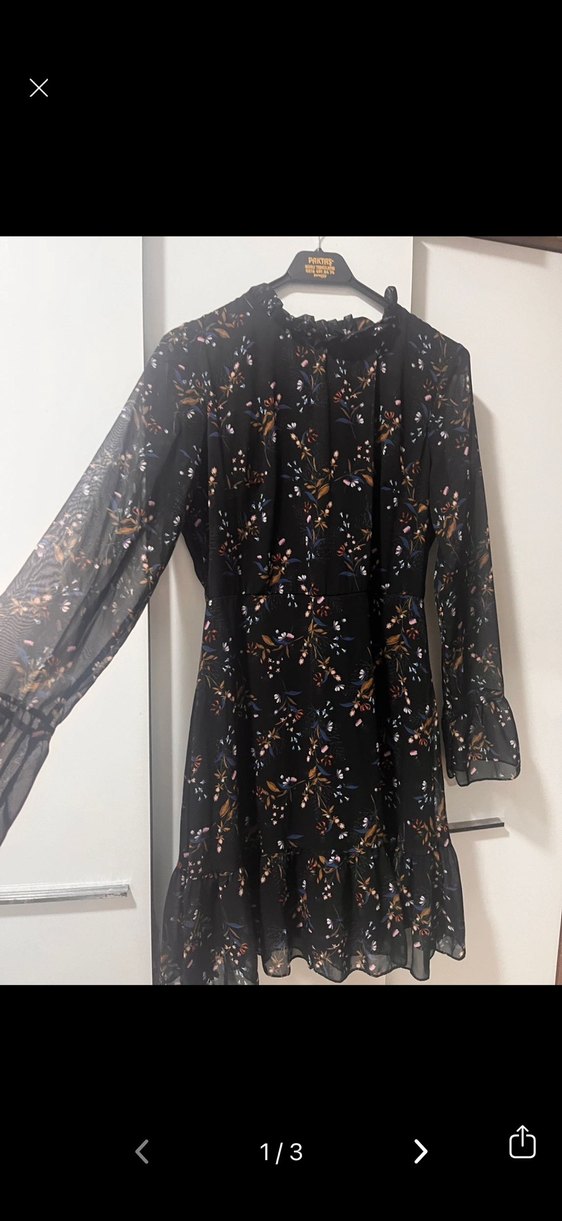 Siyah midi elbise, uzun kollu ve yüksek yakalıdır. Bol kesim, baskılı desen ve volan detaylarıyla romantik akşamlar için uygundur.