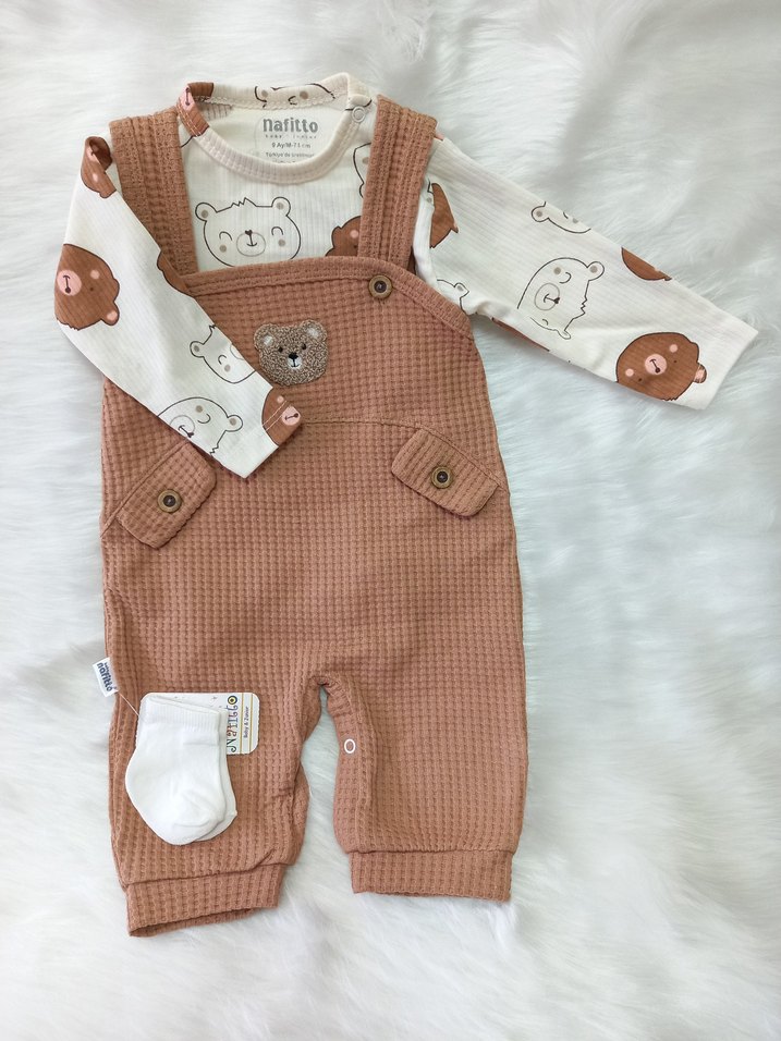 Pamuklu, uzun kollu ve bisiklet yaka kahverengi waffle Kumaş bebek tulumu. Normcore tarzında, ayıcık detaylı ve desensiz tasarım.