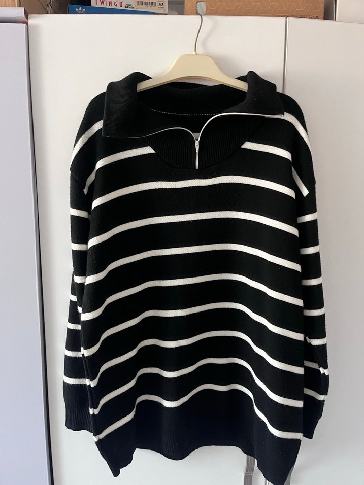 Uzun kollu, yüksek yakalı ve fermuarlı siyah kazak, çizgili örme deseniyle rahat ve salaş bir kesime sahiptir. Günlük sokak stili için uygundur.