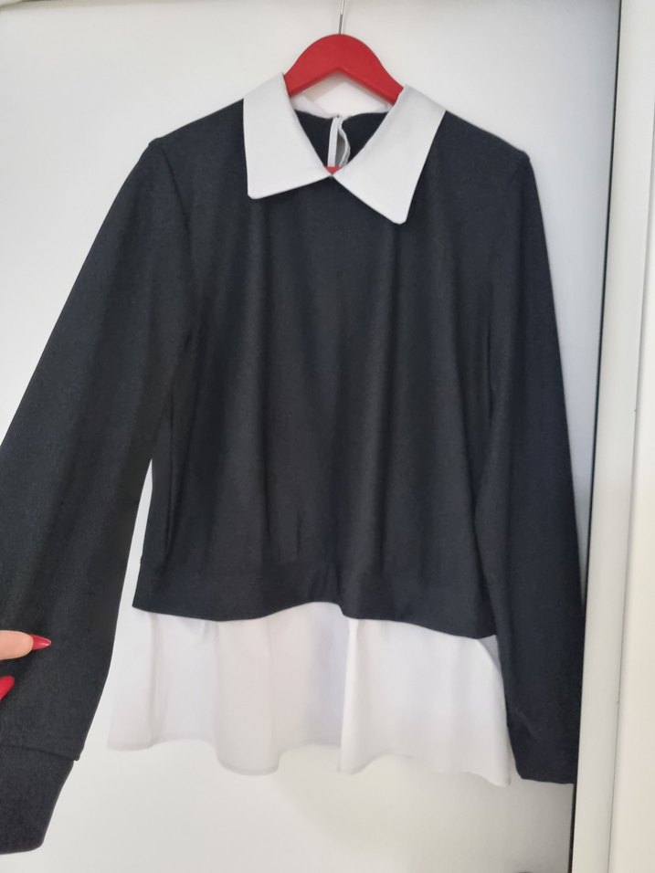 siyah renkli, yakalı ve düğmeli bluz Uzun kollu, rahat kesim ve katmanlı görünümüyle yumuşak kumaştan yapılmıştır. liralık