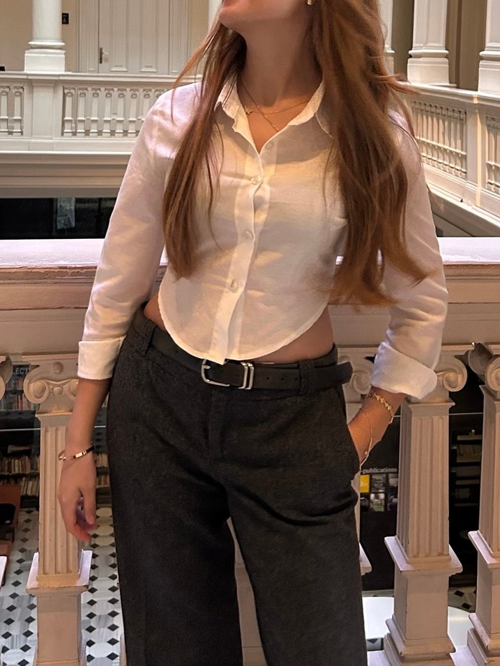 Uzun kollu, arkadan bağlamalı ,yakalı ve kemerli bu kadın ofis gömleği, rahat kesimi ve yumuşak pamuk kumaşı ile trend sokak stili için uygundur. Bej ve gri tonlardadır.