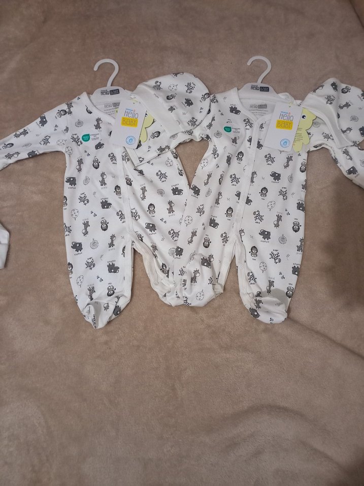 Uzun kollu, yuvarlak yakalı, yumuşak ve sıcak kumaştan yapılmış baskılı beyaz bebek tulumları. Gri detaylar ve kolay giydirme için düğmeli. Street wear tarzında. Adet Yenidogan tulum şapkalı