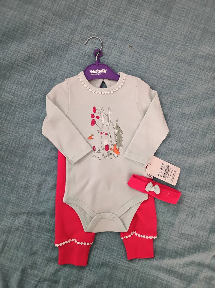 Uzun kollu yeşil baskılı ile canlı pembe pantolon ve uyumlu saç bandından oluşan bebek kız takımı. 6 9 ay