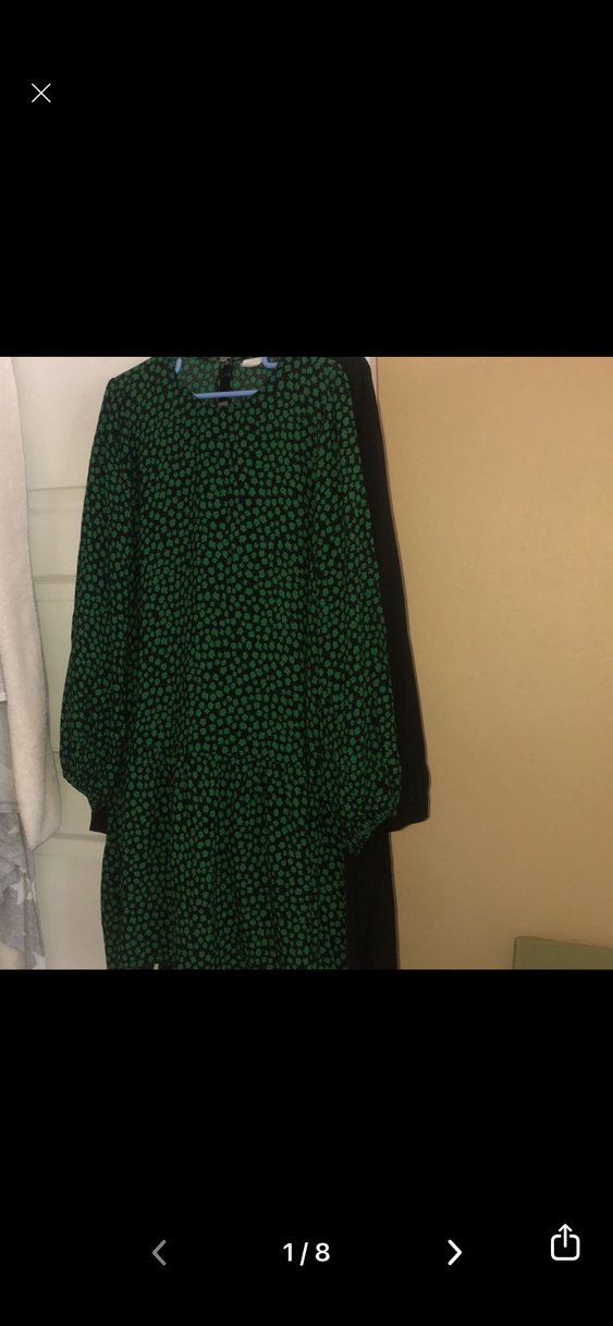 Uzun boy, bol kesim hamile tunik, uzun kollu ve bisiklet yaka. Sentetik kumaştan, drapeli ve koyu yeşil baskılı desene sahip, günlük kullanıma uygun.