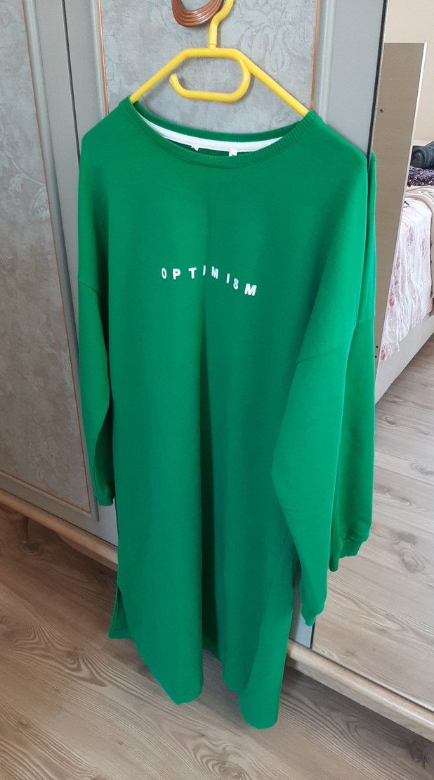 Parlak yeşil renkte, uzun kollu ve yuvarlak yakalı, baskılı 'OPTIMISM' yazılı, bol kesim uzun tunik. Yanlarda yırtmaç detaylı. Ürün sadece bir kaç kez kullanıldı