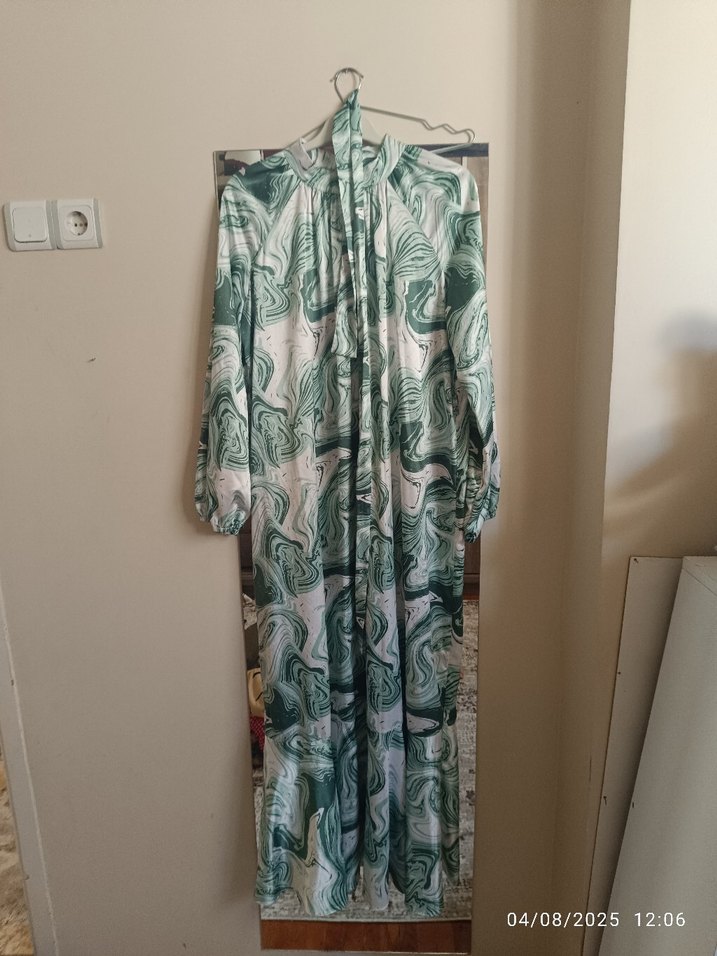 Uzun kollu, yüksek yakalı, bol kesim, drapeli yeşil ve gri batik desenli bohem tarzda elbise. Sentetik kumaştan üretilmiştir. eşarp dahil