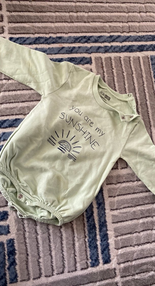 Pastel yeşil renkte, uzun kollu ve yuvarlak yakalı bebek body. "you are my SUNSHINE" baskılı, örgü dokulu ve yumuşak, sıcak kumaştan yapılmıştır. Ürün temiz sorunsuzudur sadece 1 tane çıt çıtı köprü dikilebilir 150 tl ve üzeri alışverişlerde kargo çıkışı yapılmaktadır