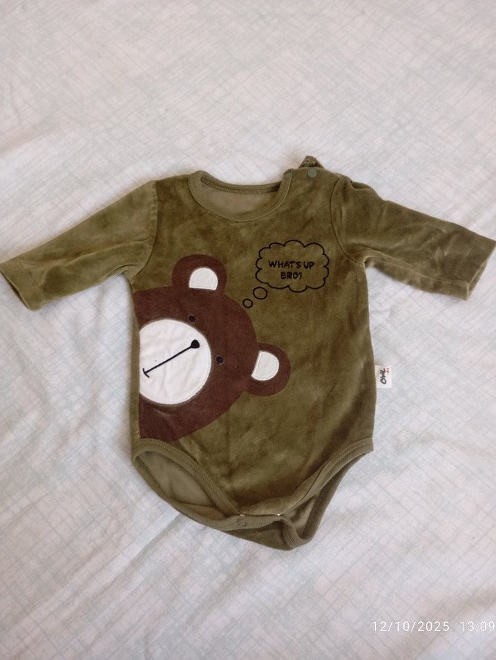 Yumuşak ve sıcak dokulu kadife , uzun kollu yeşil kahverengi bebek body. Renkli detaylı ayı baskısı bulunur. 0-3 ay