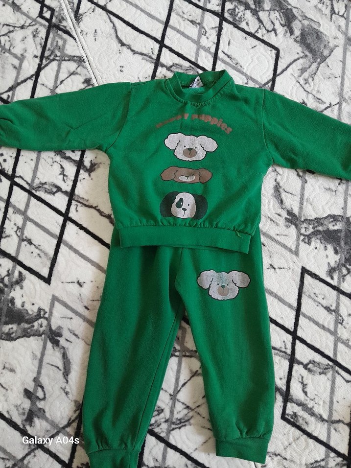 Uzun kollu ve yuvarlak yakalı koyu yeşil bebek erkek takımı. Örgü yapıda, nakışlı köpek desenleriyle sokak tarzına uygun, yumuşak ve sıcak kumaş.