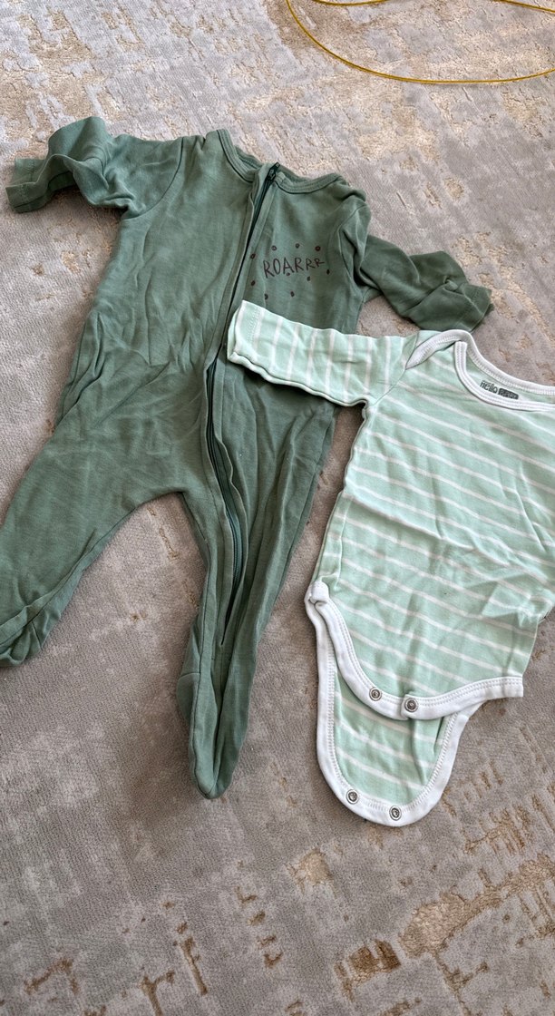Yumuşak kumaşlı, uzun kollu yeşil bebek hastane tulumu, 'ROARRE' baskılı ve kolay giyilmesi için fermuarlı. Çizgili body ile birlikte.