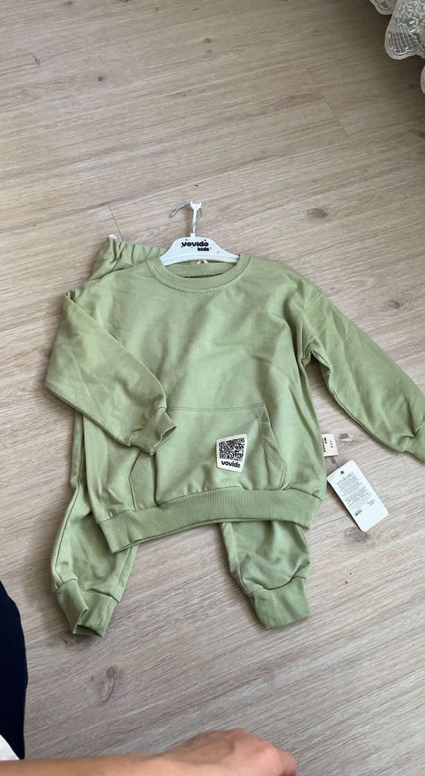 Uzun kollu, yuvarlak yakalı ve yumuşak, sıcak kumaştan yapılmış pastel yeşil renkli bebek takımı. Ön cepli, desen içermeyen ve rahat sokak stili sunar.
