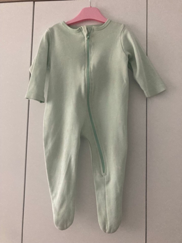 Pastel yeşil renkli, uzun kollu ve yuvarlak yakalı bebek tulumu, yumuşak ve sıcak kumaştan, kolay giydirme için fermuarlı.