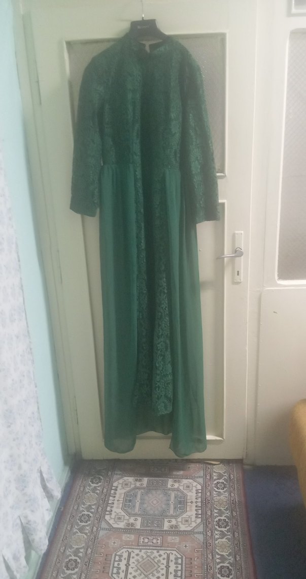 Uzun kollu, yeşil bohem abiye. Notlu yaka ve dökümlü, bol kesim model. Sentetik yumuşak kumaştan, düğünler için uygun. İki kol arası: 50 cm Elbise Boyu: 145 cm etek on astarı ile 170 cm Kol boyu : 55 cm Ürünü satın alarak DMD kas hastası Turan Ünal'ın tedavisine katkı sağlamış olacaksınız...(26)