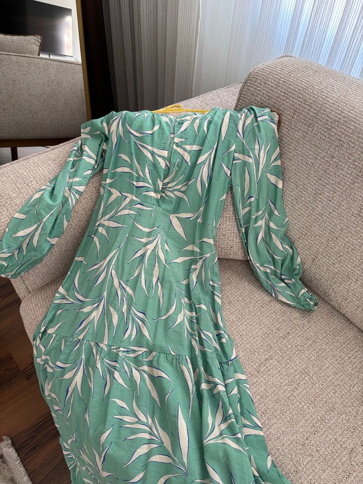 Uzun, bol kesim elbise; uzun kollu ve drapeli tasarıma sahip, pastel yeşil yaprak desenlidir.