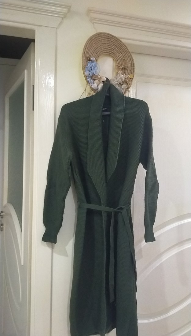 Uzun kollu, kemerli ve rahat kesimli yeşil kadın hirka Bohem tarzıyla konforlu bir görünüm sunar. uzun yapısıyla sıcak bir yapıya sahip