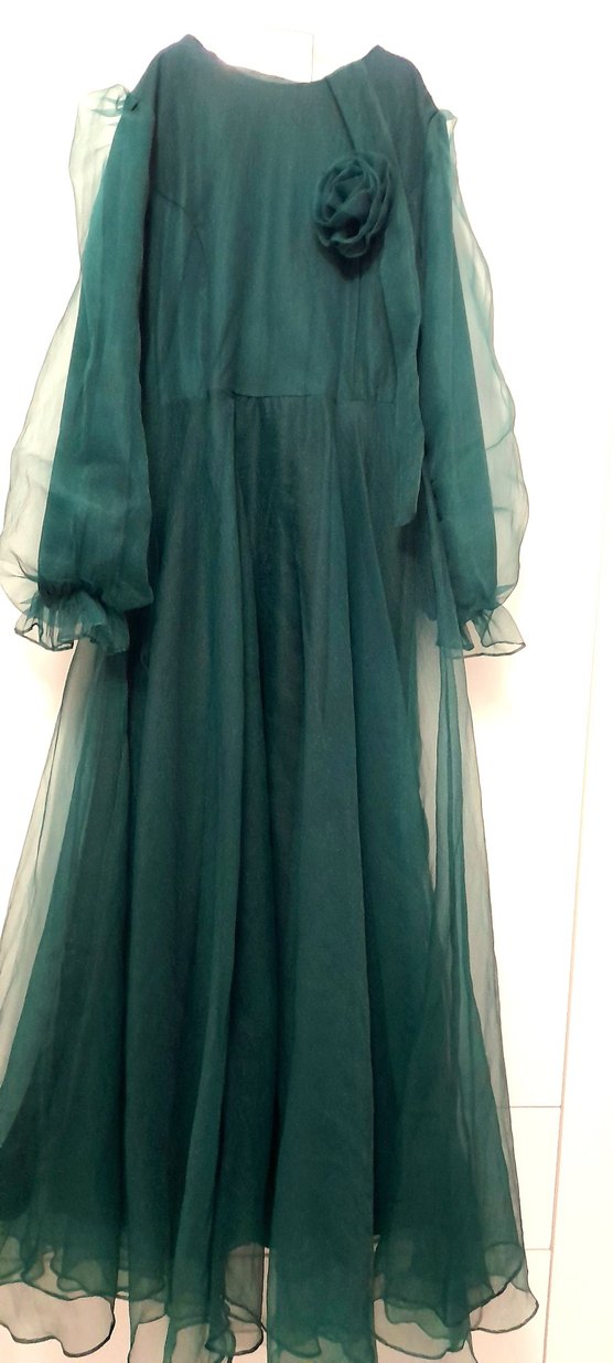 Uzun kollu, kayık yakalı ve bol kesimli koyu yeşil bohem elbise, drapeli detaylarla düğün ve vintage tarzı için uygundur. 12,13,14 yaş kız çocukları için uygundur.Prenses modeli göğüs kısmında çicek detayı ve arkadan bağlamalı kemeride vardır. 1 kere giyilmiştir.