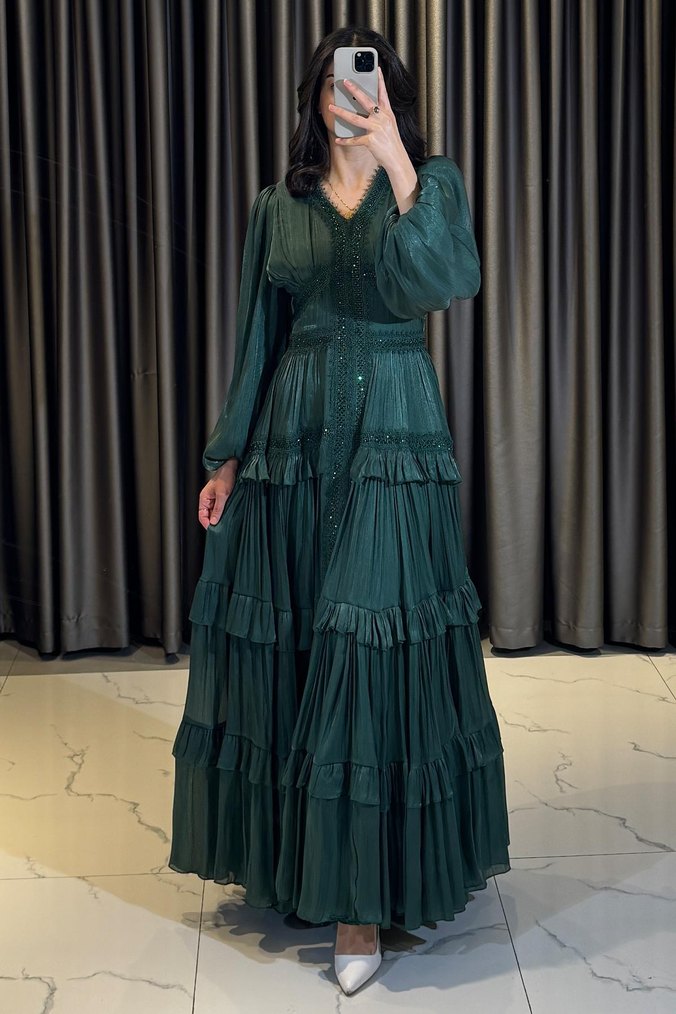 Uzun kollu, V yakalı, nakışlı ve pileli detaylara sahip yeşil bohem tarzda bol kesim abiye elbisedir. Düğünler için uygundur. Elbise sıfırdı hiç giyilmedi mağaza fiyatı:6750₺