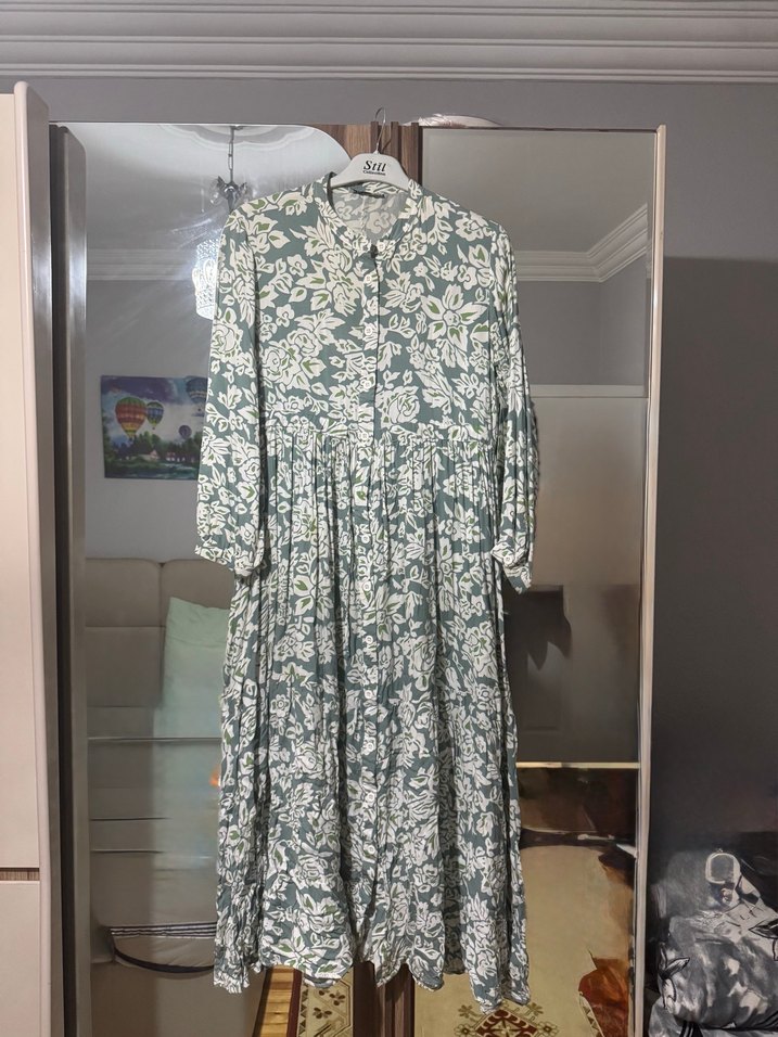 Pamuk kumaştan, uzun kollu, yüksek yakalı ve pileli detaylı yeşil baskılı uzun, bol kesim elbise. Bohem tarzını yansıtır.