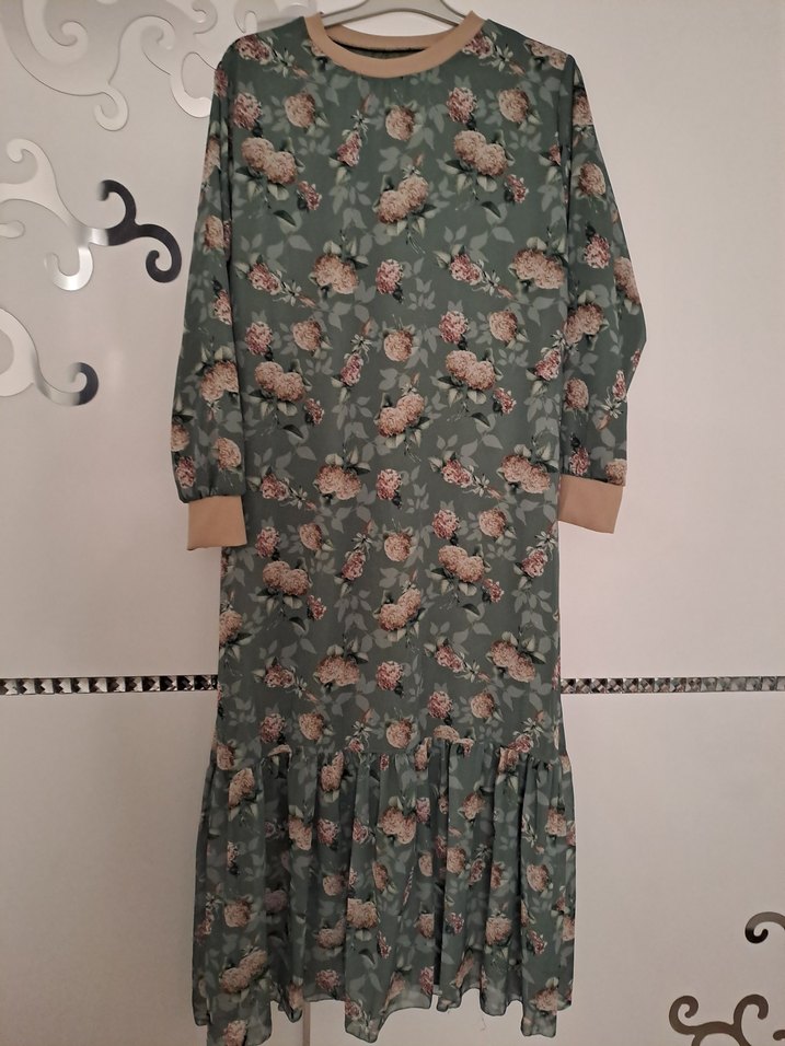 Uzun, bol kesim elbise çiçek desenli ve fırfırlı detaylara sahiptir. Uzun kollu ve yuvarlak yakalı, yeşil yumuşak sentetik kumaştan yapılmıştır.