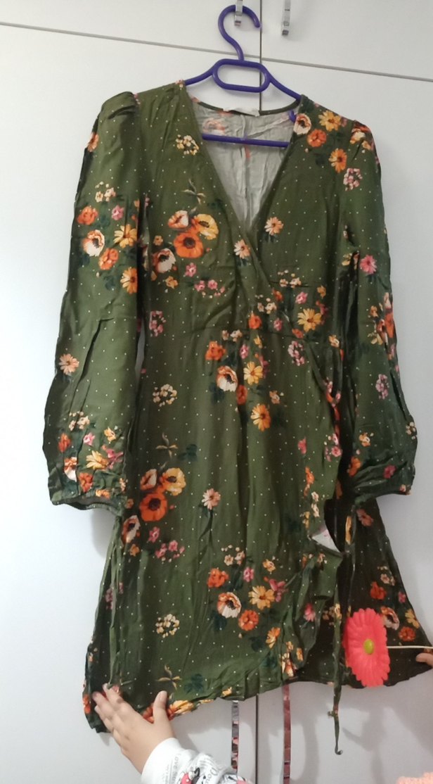 Uzun kollu, dökümlü tasarımlı, koyu yeşil çiçek desenli, V yakalı bol kesim midi bohem elbise.