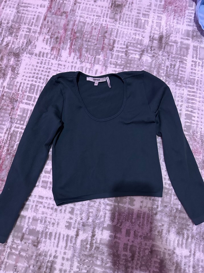 Uzun kollu, yuvarlak yakalı, yeşil renkte, sentetik kumaştan yapılmış, oturan kesimli crop top. Günlük sokak modası için uygundur. Aşırı yumuşacık rahat bir kumaşı var
